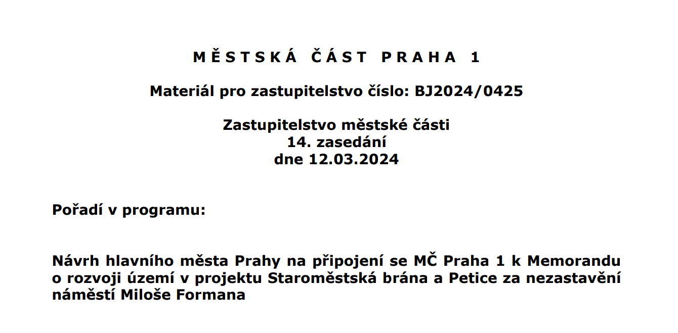 Vážení občané Prahy 1, případně celé Prahy, pokud se zajímáte o osud nám. Miloše Formana, jehož revitalizace by měla proběhnout v návaznosti na rekonstrukci bývalého hotelu Intercontinentál, tak Vás zveme na zítřejší (12. 3. 2024) Zastupitelstvo městské části Praha 1, které se koná v paláci Žofín. Bod o náměstí je zařazen na pevný čas v 19:30.